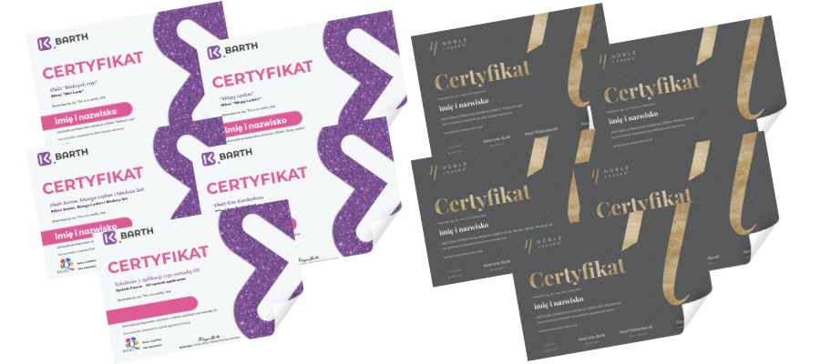 Po szkoleniu otrzymujesz 5 x certyfikaty od Centrum Szkoleniowe Katarzyna Barth oraz 5 x certyfikatów od Noble Lashes.